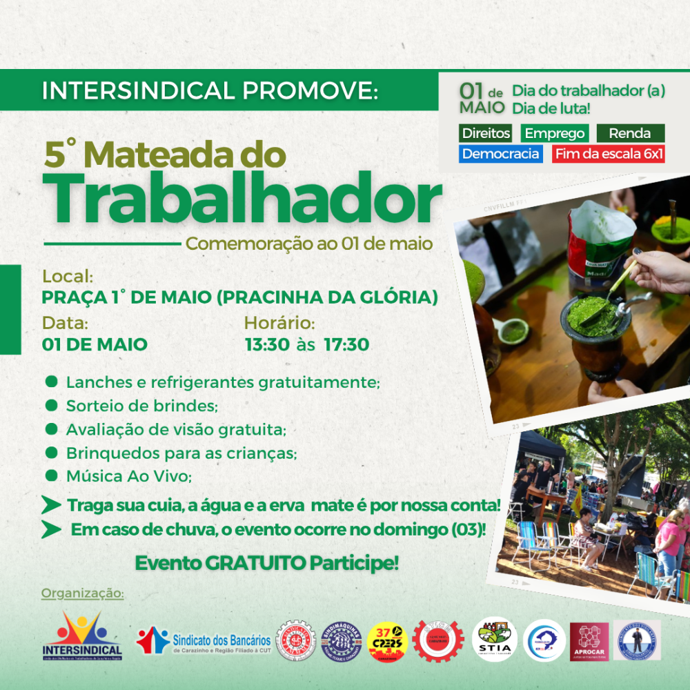 A Intersindical de Carazinho realizará, no próximo dia 1º de maio, a 5ª edição da Mateada do Trabalhador, em alusão ao Dia do Trabalhador e da Trabalhadora. O evento acontece na Praça 1º de Maio (Pracinha da Glória), das 13h30 às 17h30, e será aberto ao público, com diversas atividades gratuitas para toda a comunidade.