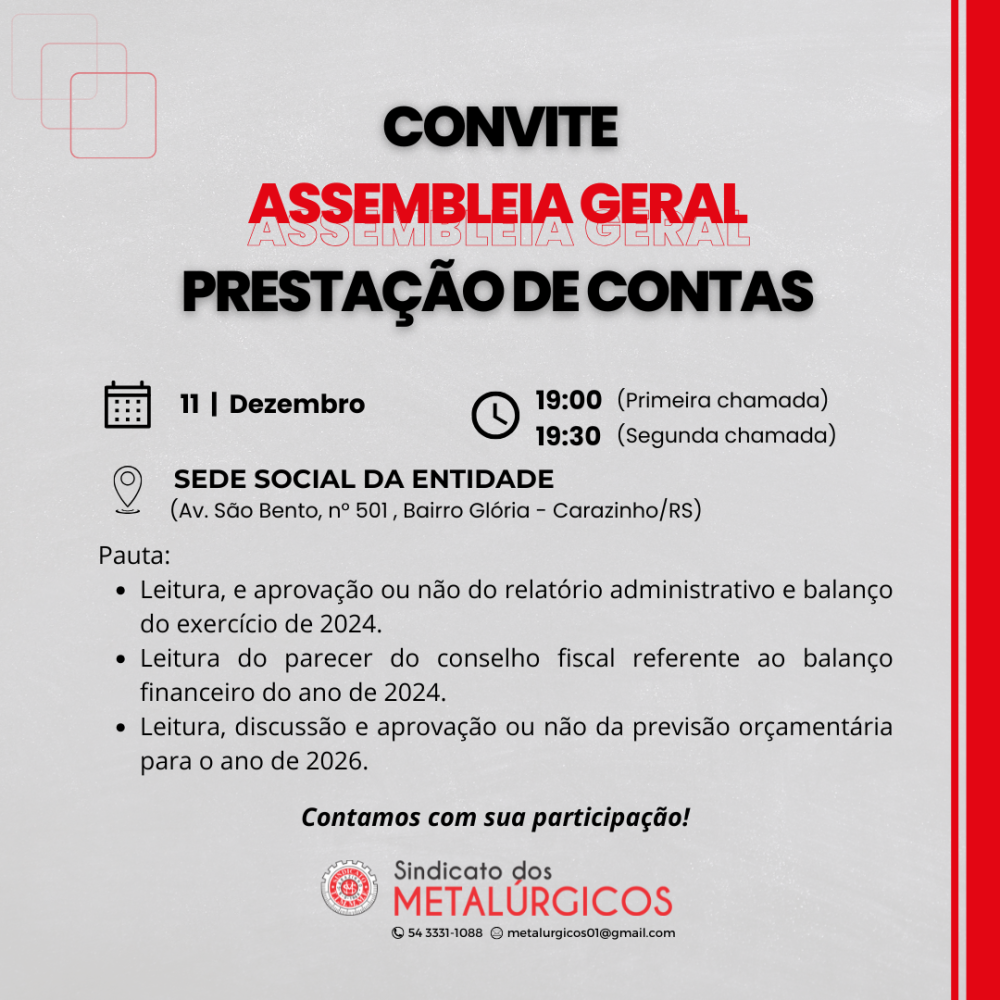 O Presidente do Sindicato dos Trabalhadores nas Indústrias Metalúrgicas, Mecânicas e de Material Elétrico de Carazinho, no uso de suas atribuições legais e estatutárias, artigo 18 e artigo 19, convoca todos os associados do Sindicato, em condições de voto, que exerçam suas atividades nos municípios de Carazinho e cidades da base territorial, para que compareçam na Assembléia Geral Extraordinária, a realizar-se no dia 11 de dezembro de 2025, às 19 horas, em primeira convocação ou às 19 horas 30 minutos, em segunda e última convocação, na sede da entidade, situado na Av. São Bento, n° 501 Bairro Glória em Carazinho – RS, afim de deliberarem pela seguinte ORDEM DO DIA: