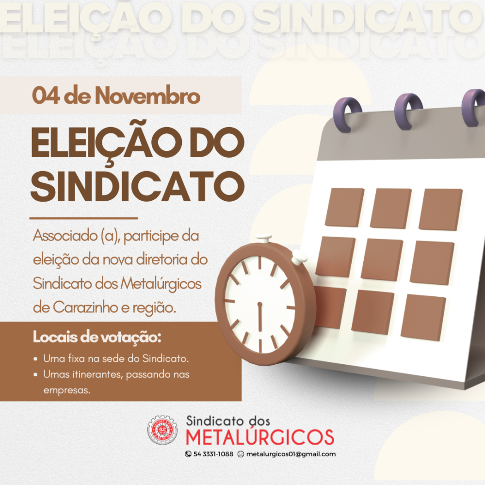 ELEIÇÕES DO SINDICATO DOS METALÚRGICOS DE CARAZINHO ACONTECEM NO DIA 04 DE NOVEMBRO
